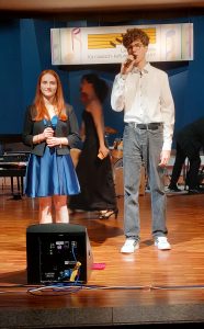 Zusammen mit neun weiteren Absolventinnen und Absolventen standen Henri und Simon nun bei der feierlichen Abschluss-Gala auf der Bühne und durften ihr vielseitiges Können vor großem Publikum unter Beweis stellen. Gemeinsam mit einer Mit-Absolventin war Henri Schmitt im Doppel-Einsatz bei der Show: Nach der Begrüßung der Projektleiterin Eva Kieser übernahm Henri das Mikrofon und führte als Moderator souverän durch das abwechslungsreiche Programm und wechselte dann nach den Ansagen schnell wieder auf die Seite der Darbietenden.