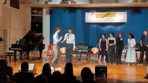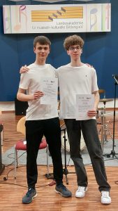 PWG-Musiklehrerin Louisa Maas hatte Henri und Simon auf die Musikmentoren-Ausbildung aufmerksam gemacht und sie zu einer Teilnahme motiviert. Sie war bei der Abschluss-Gala in Ottweiler ebenso vor Ort wie Schulleiter Andreas Brust und die PWG-Absolvent*innen der Vorjahre: Matteo Becker, Carla Lukas und Ash Groß waren mit dabei, um den „Neuen“ für ihre Auftritte die Daumen zu drücken. Ash Groß hatte den 2026er-Jahrgang während der Ausbildungswochenenden zudem als Betreuerin begleitet und unterstützt. Die PWG-Delegation wurde von den Eltern und Geschwistern der neuen Musikmentoren komplettiert, die an diesem Abend wirklich stolz auf die Leistung ihrer Kinder/ Geschwister sein konnten.