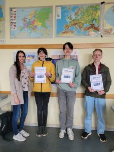 Ausgezeichnete Geographie-Kenntnisse: Die drei Erstplatzierten beim Schulentscheid „Diercke Wissen“ mit Organisatorin Tatjana Robert