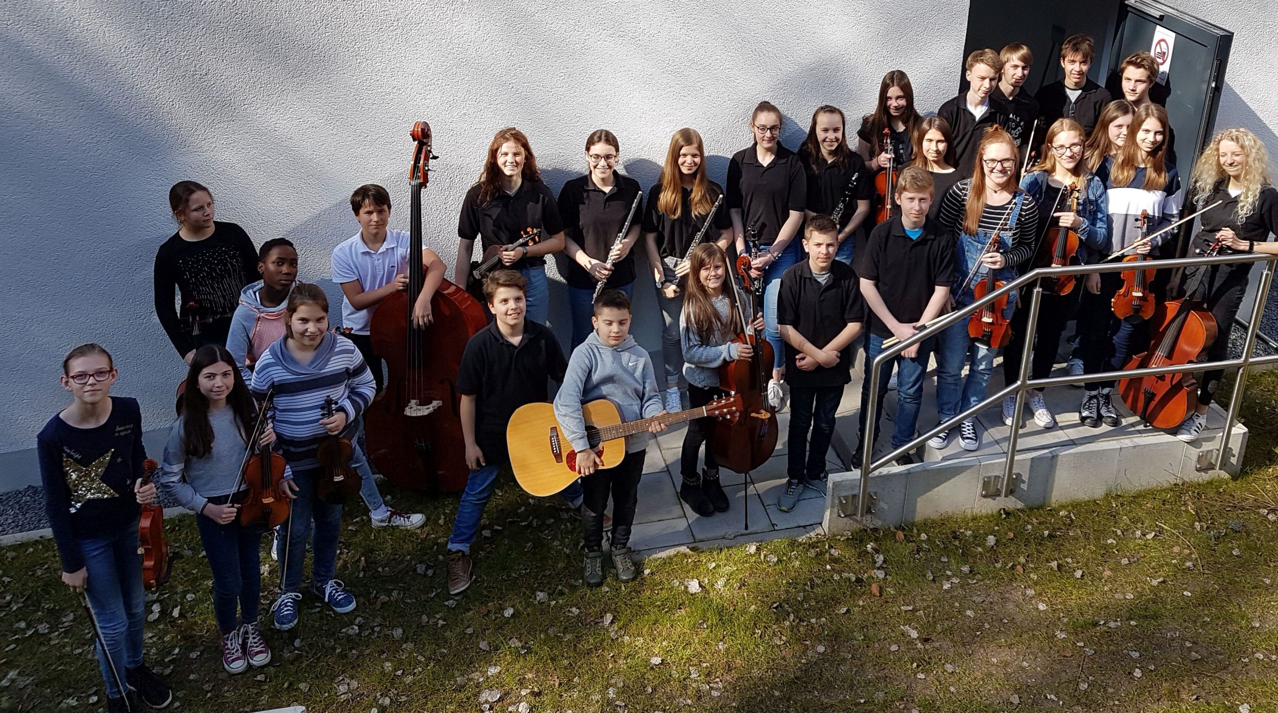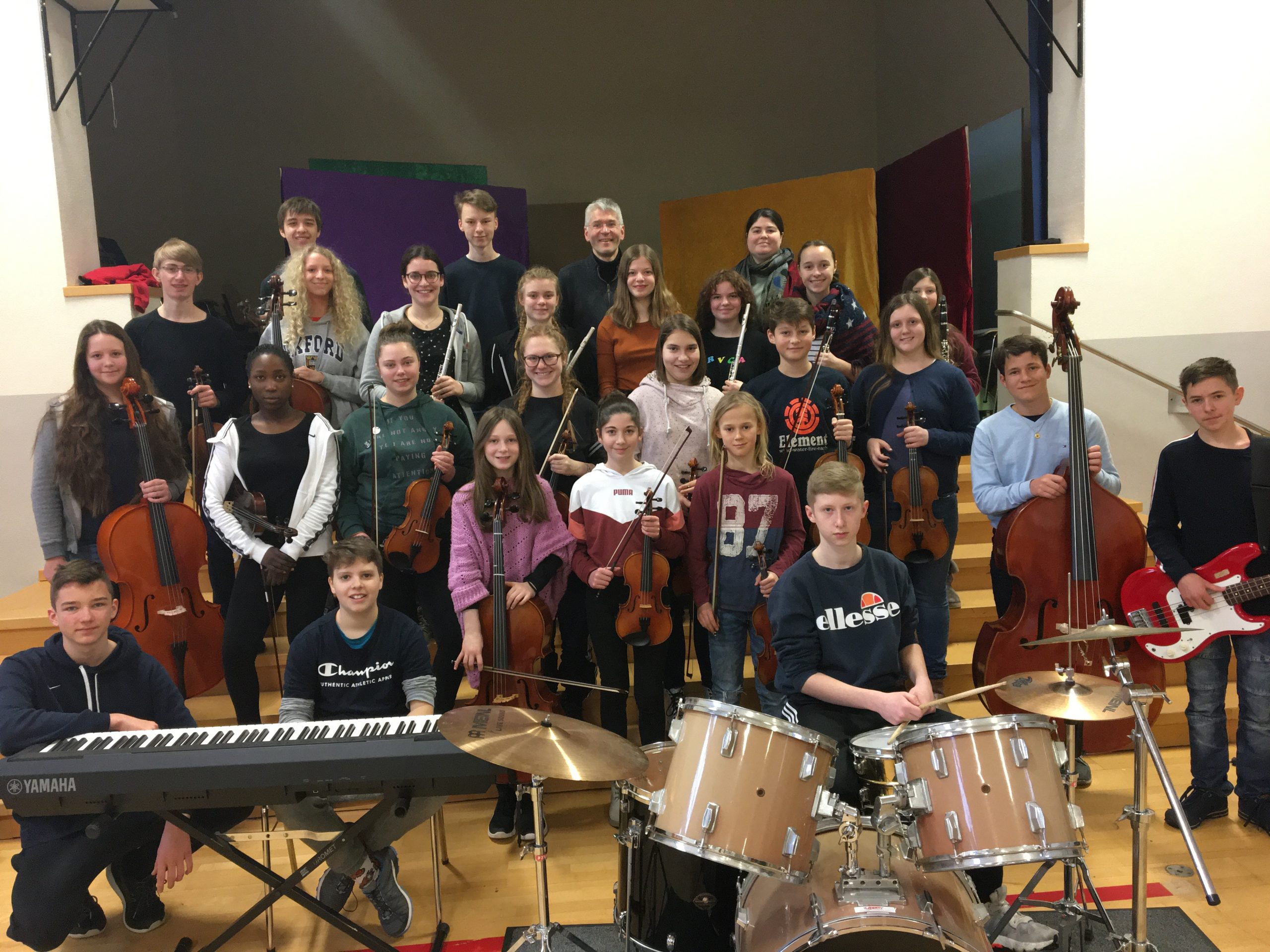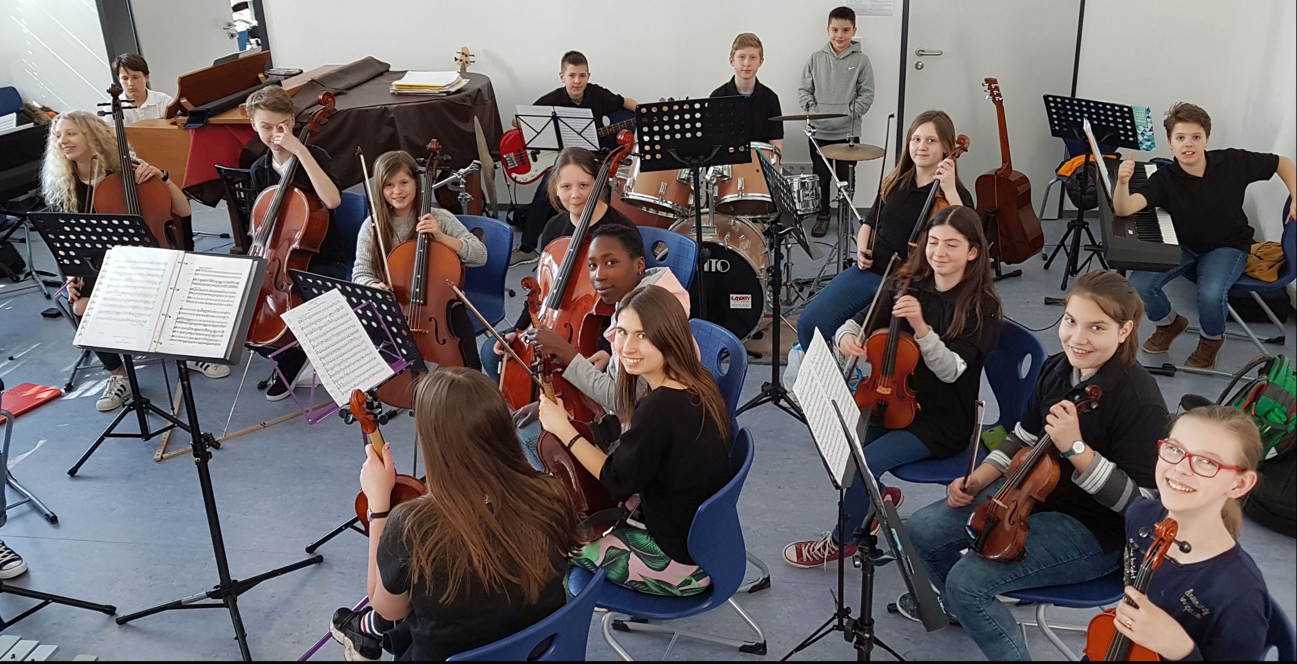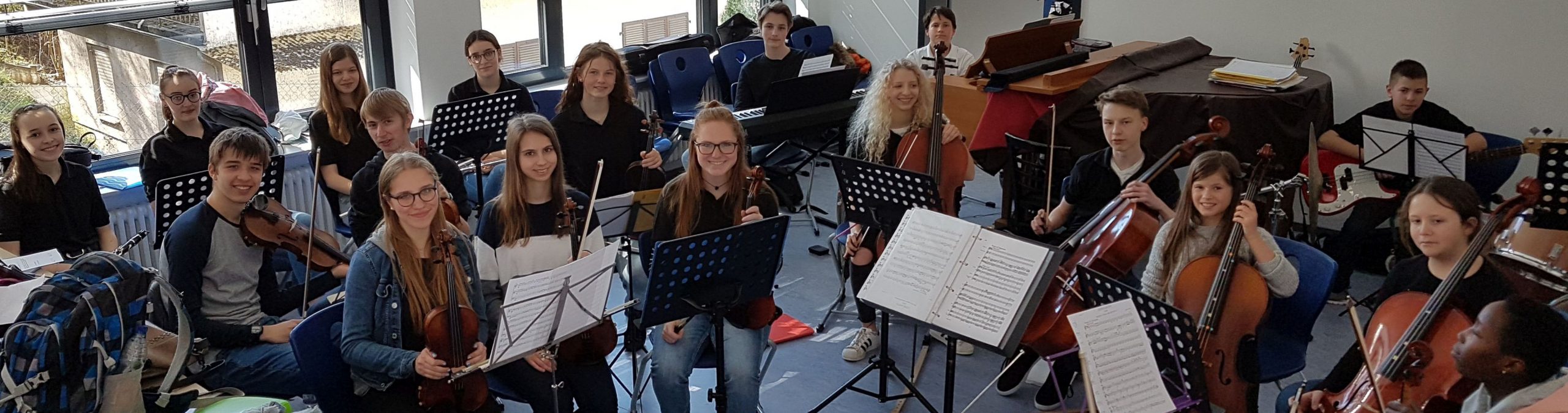 Jeden Freitagnachmittag treffen sich mehr als zwei Dutzend hochmotivierte junge Musikerinnen und Musiker aller Klassenstufen mit ihrem Leiter, Herrn Peter Hahn, zur gemeinsamen Orchesterprobe. Die meisten von ihnen spielen ein Streichinstrument (Violine, Viola, Violoncello, Kontrabass), aber alle anderen Instrumentengruppen sind – wie in einem großen Sinfonieorchester üblich – in kleinerer Zahl natürlich auch vertreten und wichtig: Holz- und Blechbläser, Spieler von Schlag- und Tasteninstrumenten. Denn: